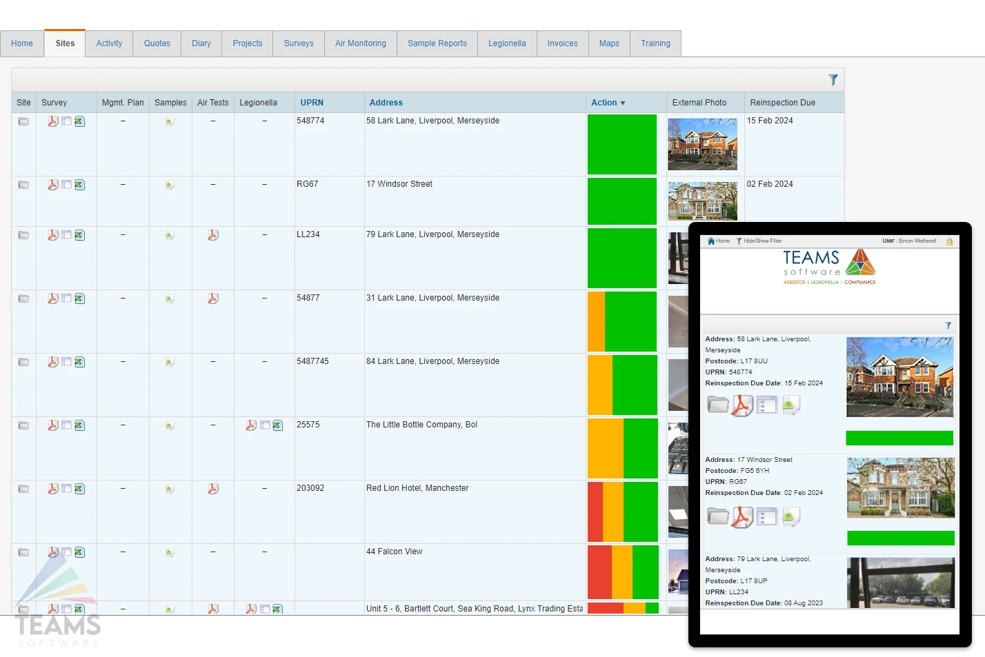 The Sites by Risk feature in the TEAMS client portal includes quick links to the latest asbestos survey report for each individual site, as well as links to the latest bulk sample reports and interactive survey views. Additionally, any additional third-party site documents stored on the portal can be accessed through this feature.