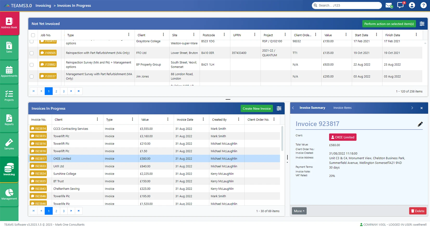 Completed jobs and projects are instantly available in the invoicing section of the TEAMS system, where invoices are categorised as 'in progress' or 'awaiting invoicing'. Easy-to-use tools allow your team to efficiently manage multiple invoices and make adjustments to individual components. Invoices can be issued to clients individually or in bulk.